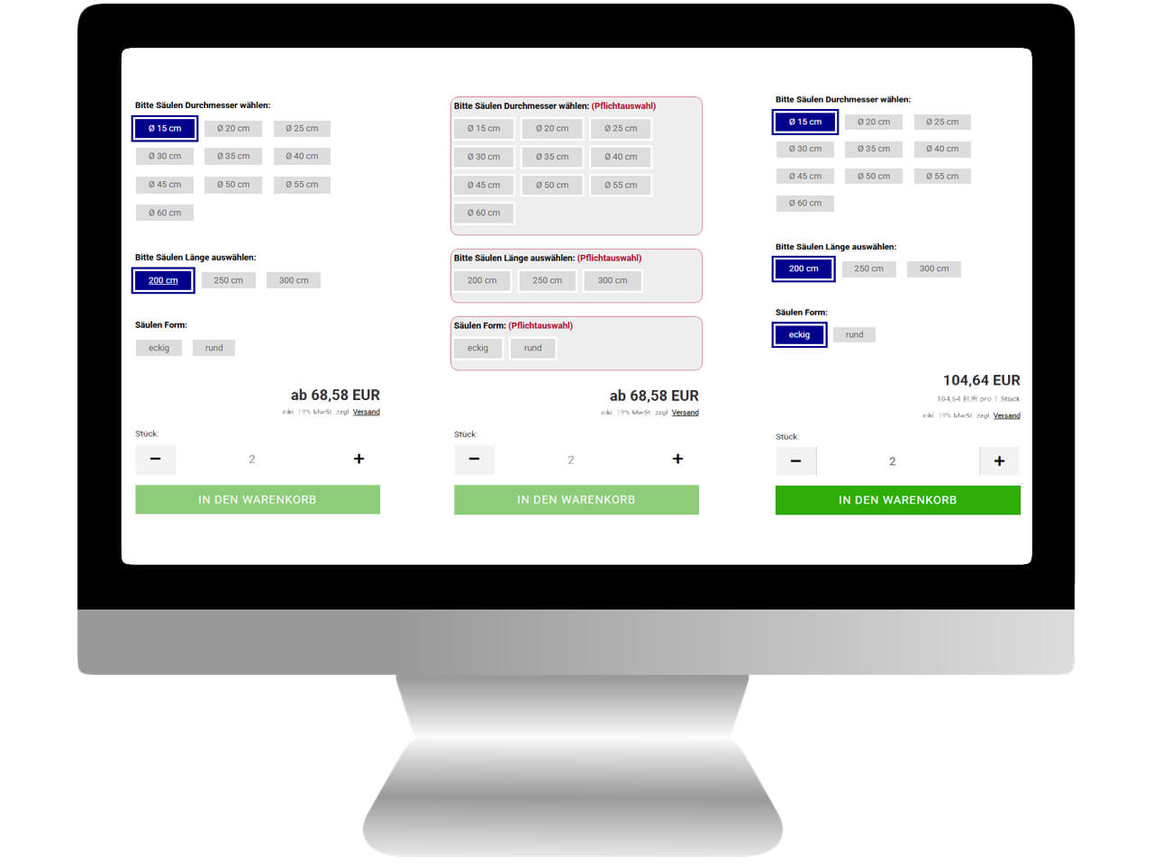 Bild 2: Sobald die Optionen nach und nach ausgewählt werden, verschwinden der **Rahmen** und der rote Hinweis "(PFLICHTAUSWAHL)".