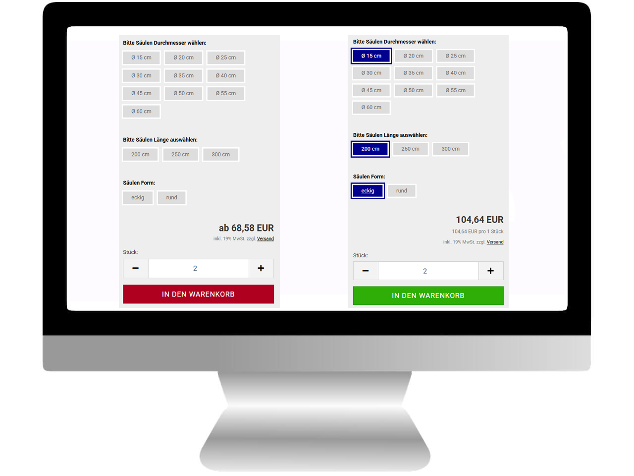 Bild 1: Solange nicht alle Optionen/Varianten/Zusatzoptionen ausgewählt sind, bleibt der Gambio "IN DEN WARENKORB" Button **rot**.