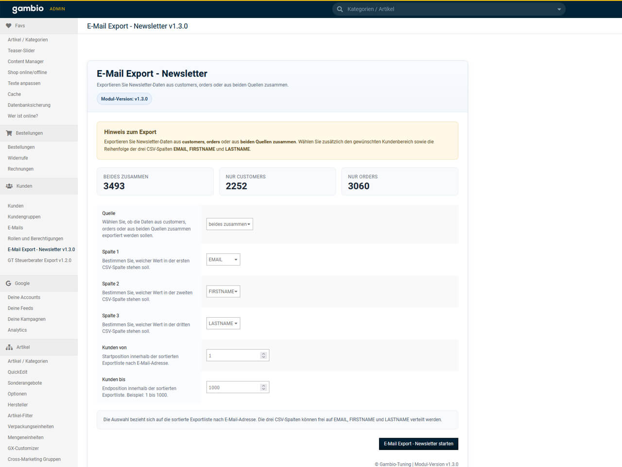Gambio GTExport Modul für den Export von E-Mail-Adressen und Kundendaten